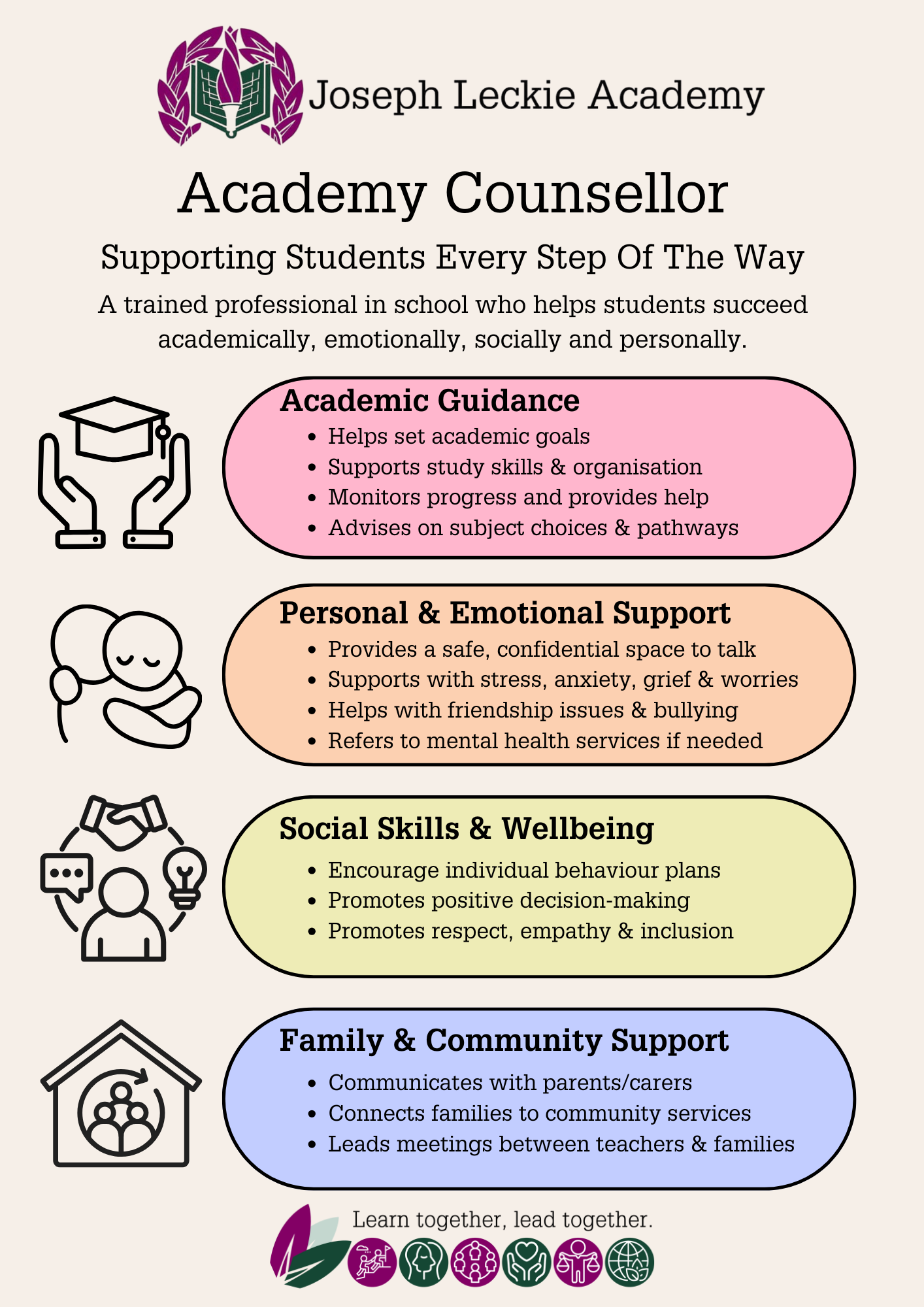 At Joseph Leckie Academy the wellbeing and positive mental health of our students and all of our stakeholders is a core aim. We aim to promote a caring, supportive environment in which each individual is valued and respected and to consider the wellbeing and mental health needs of our staff, students, parents and carers in both our educational provision and outreach support. We recognise that mental health and wellbeing are as important as physical health and educational support and, to this end, we have high expectations for all and aspire to achieve excellence.