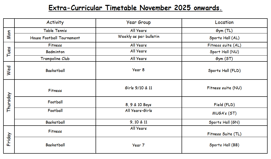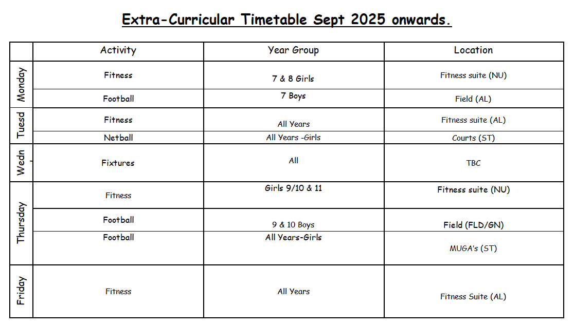 Please see below for our Extra Curricular Timetable, this is updated frequently with lots of great activities for our students' to take part in.